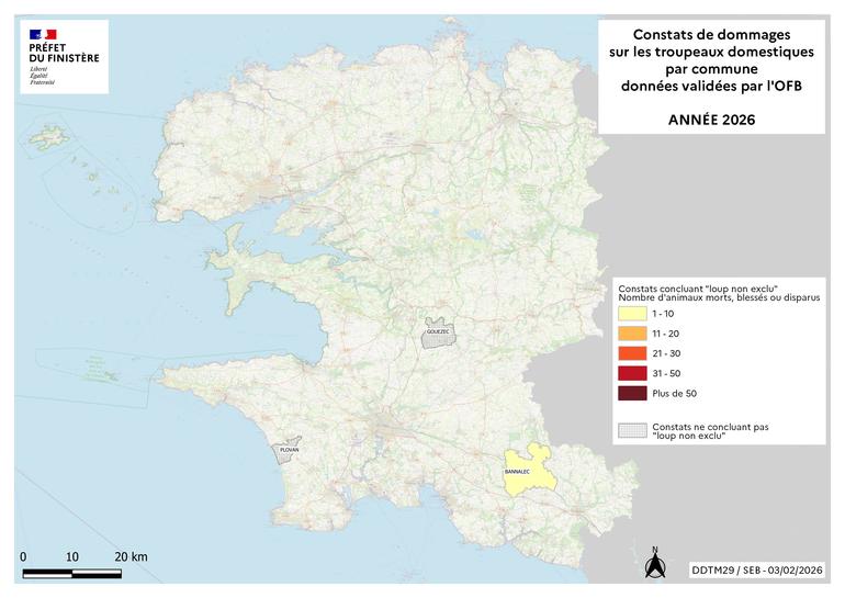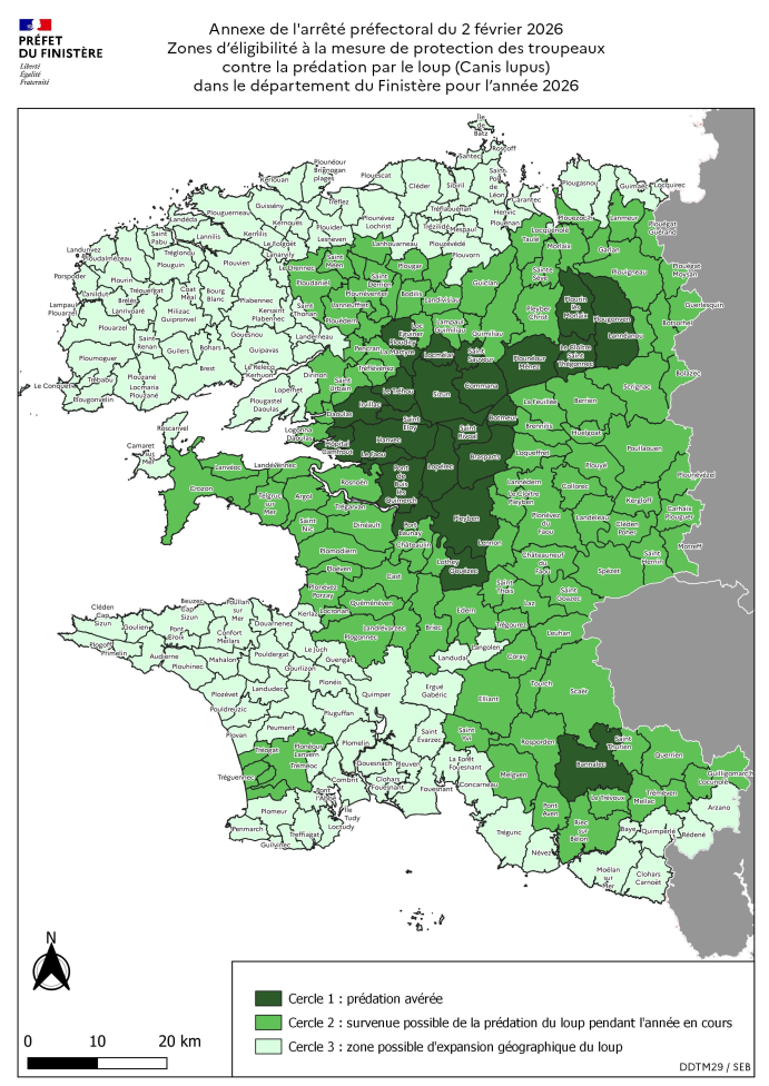 Le loup est de retour dans le Finistère après plus d’un siècle d’absence. Depuis sa première observation le 4 mai 2022, sa présence sur le département a été régulièrement documentée (photographies, indices…) et plusieurs attaques sur des troupeaux ont été confirmées par l’Office Français de la Biodiversité (OFB), qui est en charge du suivi de l’espèce pour le compte de l’État.